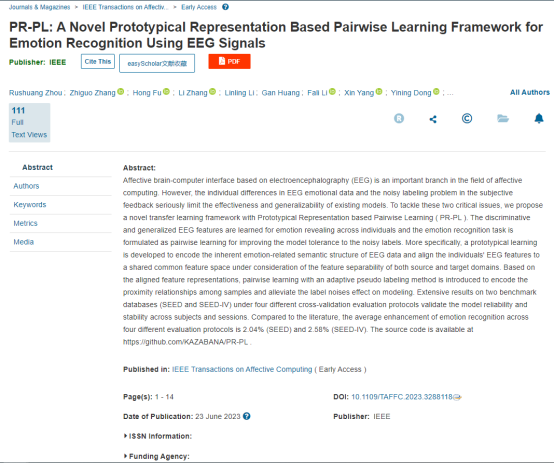 近日,我校医学部生物医学工程学院梁臻老师课题组在情感计算领域顶级学术期刊《IEEE Transactions on Affective Computing》(影响因子11.2)上,发表了一篇题为“PR-PL: A Novel Prototypical Representation based Pairwise Learning Framework for Emotion Recognition Using EEG Signals”的高质量论文。深圳大学2018级本科生周如双同学(目前在香港城市大学生物医学工程学院攻读博士学位)和哈尔滨工业大学(深圳)张治国教授为共同第一作者,深圳大学梁臻副教授为独立通讯作者。深圳大学为第一作者单位和通讯单位。