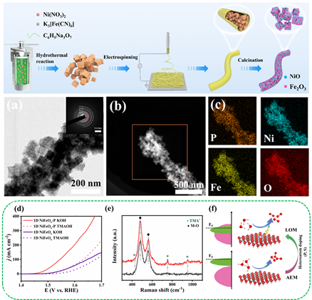 深圳大学何传新团队通过P掺杂诱导NiFeOx的OER活性的显著增强现象成功揭示了OER机制从AEM到LOM的转变。研究表明,P掺杂诱导了晶格应变的形成,促进了NiO向NiOOH的重构。同时,密度泛函理论证实,P掺杂也可以显著增强原位生成NiOOH的金属-氧共价性,从而激活晶格氧,触发LOM机制。电化学化学探针实验证明了P掺杂后,OER机制受到了晶格氧的严重制约。因此,掺P的1D NiFeOx打破了AEM机制中的线性关系,实现了237 mV的OER过电位(1 M KOH)。令人印象深刻的是,在S掺杂的1D NiFeOx上也观察到这种机制转变,因此,这种转变可能是杂原子掺杂的OER电催化剂的普遍现象。本文所证明的OER机制转变为开发打破固有线性关系的掺杂类OER电催化剂提供了重要的指导和新的设计概念。