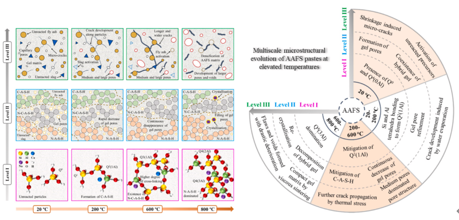 图1.碱激发材料在高温作用下的多尺度微观演变规律