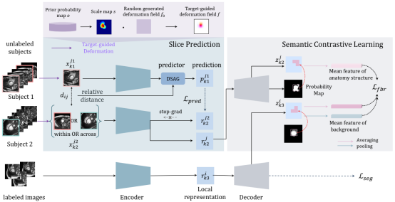 图本文所提出的表征学习框架。以三维体数据为例,主要包含无监督切片特征预测(SlicePrediction)和半监督语义对比学习(SemanticContrastiveLearning)两部分结构。