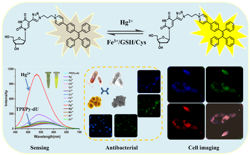 摘要图: 有机合成的多功能核苷-AIE探针:Hg2+和Fe3+/GSH/Cys的可逆响应、生物成像和抗菌