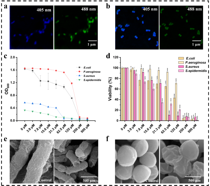 图: (a).大肠杆菌和(b).金黄色葡萄球菌分别在405和488nm激光激发下与TPEPy-dU孵育10分钟后的CLSM图; (c).不同浓度的TPEPy-dU对大肠杆菌、铜绿假单胞菌、金黄色葡萄球菌和表皮葡萄球菌生长的抑制作用与培养时间的关系; (d). 细菌细胞活力评估处理18小时。注:与对照组相比,ns无显著差异,**P<0.01,***P<0.001, ##P<0.01; (e).大肠杆菌和(f).金黄色葡萄球菌的SEM图;注:左图---没有处理的空白;右图---用TPEPy-dU处理4小时)。