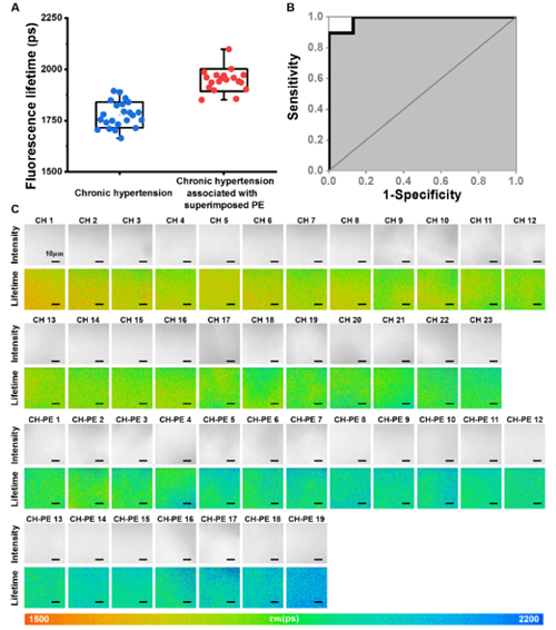 此外,为实现早期诊断,在孕12周收集了42例慢性高血压的血清样本,经标记和荧光寿命成像后,成功地将子痫前期患者与慢性高血压孕妇区分。使用超高效液相色谱法对孕妇血清进行非靶向脂质组学进行验证,证实荧光寿命成像技术在子痫前期疾病诊断上的有效性和精确性。