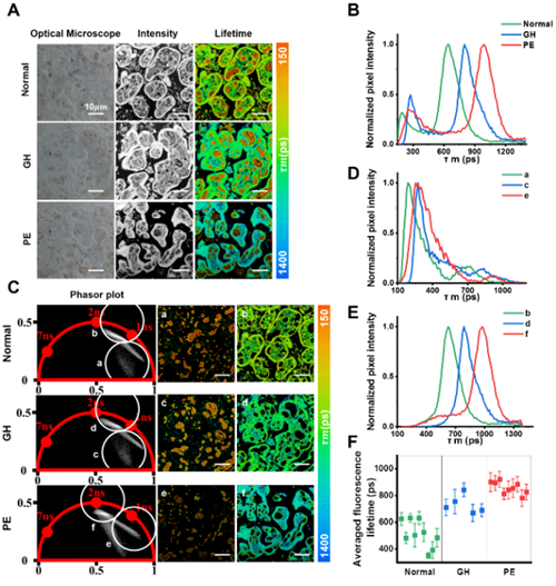 子痫前期是一种常见的妊娠期高血压疾病,影响2-8%的妊娠,可导致严重后果,包括孕产妇和胎儿死亡。当前,PE的早期诊断方法仍然很少,因此,开发一种无创、高度准确、易于使用的诊断方法来监测PE及相关并发症的发生和发展至关重要。在本研究中,课题组提出了一种基于检测孕妇外周血的荧光寿命诊断方法。首先,对23例胎盘切片和162例妊娠晚期产妇外周血血清进行尼罗蓝染色和荧光寿命成像。探针的荧光寿命随着疾病的恶化而显著增加(p < 0.0001)。探针的表征结果显示,在低极性条件下,探针的寿命有增加的趋势,揭示了血清样品寿命差异的原因是血清脂质代谢异常引起的极性变化。
