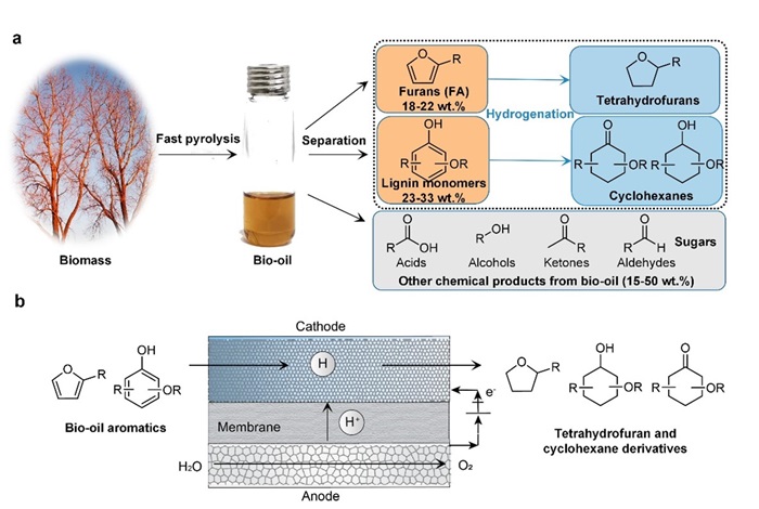 基于全球气候变暖,碳减排和碳中和的背景,利用可再生能源生产的绿色电力,将生物质通过电化学的方法升级为高附加值化学品和燃料吸引了越来越多的研究关注与兴趣。通过热解自然界中不可食用的木头等材料获得的木质纤维素生物质油包含有约40–55 %的呋喃和酚类木质素单体(如下图),可作为有机原料应用于多种重要的化工与医药生产,加氢还原可以用来稳定不饱和的生物质油以及提升价值。然而,当前的相关有机电催化加氢反应均存在生产速率(反映为目标产物的偏电流密度)过低的问题,这导致无法满足进行实际工业化生产的需求。基于前期的工作基础,赵伟课题组研发了适用于电有机加氢反应的膜电极反应器,使用金属铑作为扩散电极,对呋喃和木质素单体有机小分子进行耦合电解水加氢反应。金属铑电极巨大的表面活性面积与选择性催化活性,膜电极反应器的高效传质能力,巧妙的平衡了大电流和能量利用效率之间的矛盾,实现了大于300 mA·cm-2的工业级电流密度,以及高达64%的目标加氢产物法拉第效率,极大的提升了此类电有机反应的速率,拓展了实际生产应用的可能性。原位电化学红外吸收光谱实验观测了电催化加氢的具体反应路径,明确了机理。技术经济可行性分析表明该高效电催化加氢系统对于实际生物质油炼制应用具有大规模盈利的潜力,该工作对生物质有机分子电催化加氢升级的研究以及新型高效的反应器设计开发具有借鉴意义。