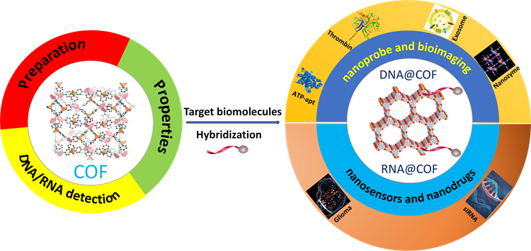 摘要图: DNA/RNA杂交的COF纳米探针在生物分析检测、临床生物医学和生物标志物成像等方面的潜在应用