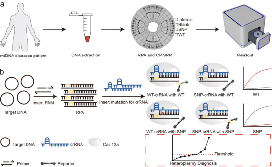 具有致病性线粒体DNA (mtDNA)点突变的患者通常会出现致残性神经系统综合征,导致严重残疾和过早死亡[1]。至少有1/5000的人口受到mtDNA疾病的影响[2]。线粒体遗传疾病的单核苷酸多态性(SNP)通常存在异质性[3],即:野生型和突变型共存。突变异质率不同的个体表现出不一样的临床症状[1]。同质的mtDNA突变可以很容易地在血液中检测到。然而,对于异质突变,突变mtDNA的百分比水平因组织而异,并且在同一个体中也可能随时间而变化(例如,导致Leber遗传性视神经病变(LHON)的m.11778A>G)。因此SNP异质率的精确检测对线粒体遗传疾病的诊断至关重要。最近,基于CRISPR的分子诊断技术因其特异性强、灵敏度高、检测速度快等优点受到广泛关注[4, 5]。例如,巢式RPA和CRISPR/Cas12a辅助病毒鉴定的多重分析平台(MAPnavi)被用于快速(< 40分钟)诊断多种呼吸道病毒[6]。然而,这些单信号输出方法难以准确诊断mtDNA疾病的异质性水平,因为结果受到样本中模板总量的影响。与基因组SNP基因分型不同,mtDNA疾病的异质性水平诊断需要更准确的SNP丰度定量,这仍然是一个挑战。