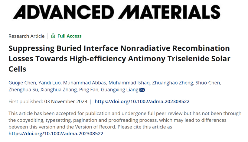深圳大学物理与光电工程学院梁广兴研究员课题组在Advanced Materials(影响因子29.4,中科院JCR一区,Top期刊)上发表题为“Suppressing Buried Interface Nonradiative Recombination Losses Toward High-efficiency Antimony Triselenide Solar Cells”的最新研究论文。深圳大学梁广兴研究员为论文通讯作者,其指导的博士研究生陈国杰为论文第一作者,深圳大学为唯一通讯单位。