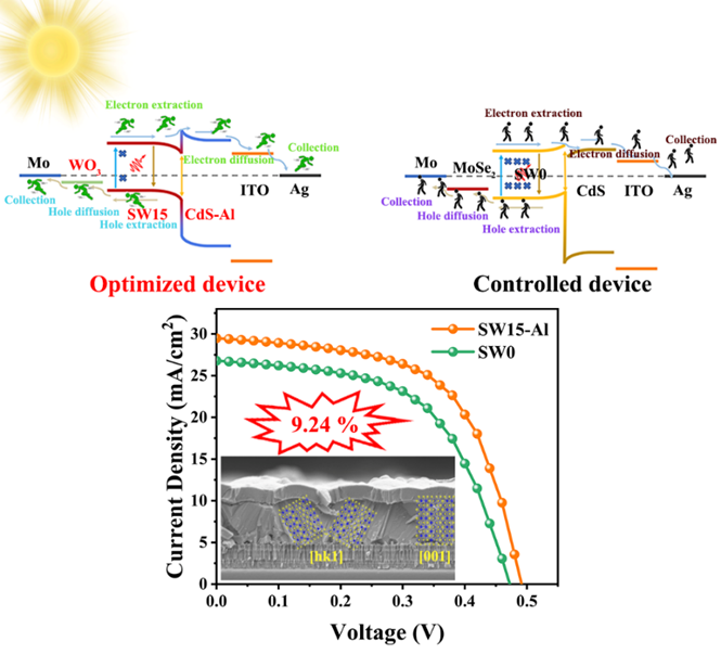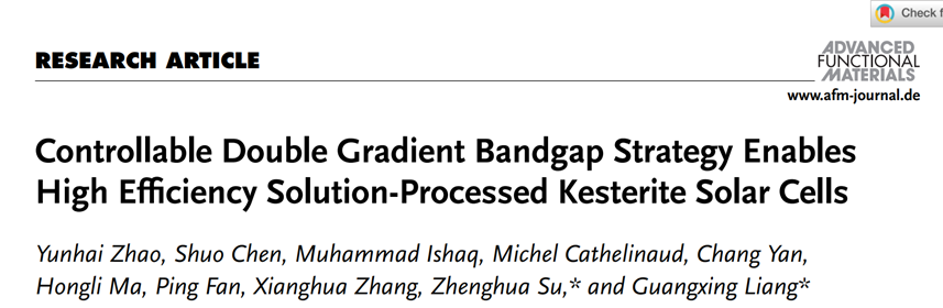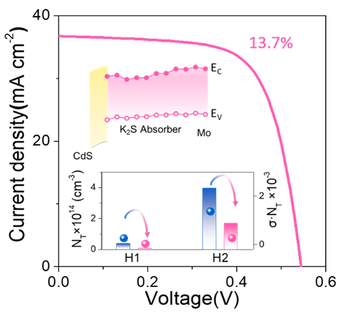 锌黄锡矿半导体Cu2ZnSn(SxSe1-x)4(CZTSSe)同样是因为其元素廉价无毒以及具有大于32%的理论光电转换效率成为很有前途的新型薄膜光伏材料之一。近年来CZTSSe薄膜太阳电池的效率不断攀升,但仍远低于其理论值,这主要归因于带隙和电位明显的波动,较短的少数载流子寿命以及缺陷引起的严重载流子复合;铜铟镓硒(CIGS)的成熟经验证明双梯度带隙结构使太阳电池兼具良好的电子输运特性和较高的开路电压,然而实现双梯度带隙结构对高温硒化成膜的CZTSSe太阳电池来说极具挑战。本文通过调整前驱体薄膜中K2S层的位置和K2S溶液的浓度,可实现调控带隙最小值(缺口)的位置和深度,避免由于不合适的前梯度起始位置和不理想的带隙缺口而产生的电子屏障;晶粒生长过程中K和Se的高亲和能容易形成K2Se3等K-Se液体中间相,它们沿着薄膜内的空隙和晶界流动,不仅降低熔点加速硒化,还可作为硒源使薄膜的硒化更加充分;碱金属K的引入促进了晶粒生长过程中各元素的扩散,使吸收层更大比例的组分参与晶粒生长,从而稳定Sn含量,深能级缺陷VSn和CuSn得到抑制,最终构建出CZTSSe薄膜太阳电池光电转换效率达到13.7%,属于国际领先水平,相关研究成果发表在Advanced Functional Materials (2023)2311992(影响因子:19.0,中科院JCR一区,Top期刊),梁广兴和苏正华为通讯作者,其指导的联合培养博士生赵云海为第一作者,深圳大学为唯一通讯单位。