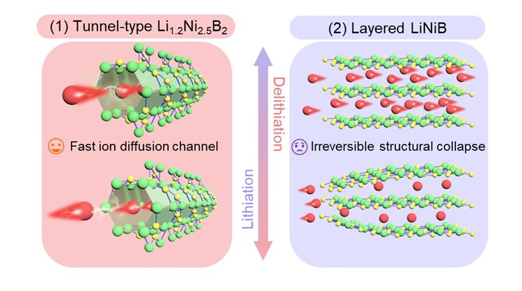 图1.孔道状Li1.2Ni2.5B2和层状LiNiB的结构示意图