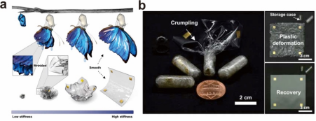 近日,深圳大学周学昌课题组受邀在《Nature Electronics》期刊“News & Views”专栏撰写题为“Electronics devices that can be crumpled and stored in capsules”的文章(Nat Electron (2024).https://doi.org/10.1038/s41928-023-01108-6)。其中张耀康助理教授为文章的第一作者,周学昌教授为通讯作者。该文章评述了韩国亚洲大学Je-Sung Koh、Daeshik Kang、Seungyong Han研究团队在可折叠电子器件领域的最新研究成果(Nat Electron(2024). https://doi.org/10.1038/s41928-023-01089-6)。该团队从蝴蝶由蛹中逐渐羽化的过程(图1a)中汲取灵感:在这个过程中,蝴蝶的翅膀从一开始柔软的皱折状态逐渐转变为光滑状态。受到这个过程启发,该团队利用异质集成结构 (heterogeneously integrated structure),将形状记忆聚合物、弹性体(聚二甲基硅氧烷)和电导性银纳米线结合在一起。这个体系通常状态下是塑性的,可以被任意揉搓、折叠。当在银纳米线网络上施加电压时,产生的焦耳热效应会推动形状记忆聚合物发生相变,进入与柔软的聚二甲基硅氧烷相匹配的弹性状态,使得整个体系变回光滑、平整的状态。这样的折叠—恢复过程在重复数百次之后也不会对该复合材料的力学、电学性能造成显著影响。该团队随后利用这种复合材料,开发出了可折皱的触控板和柔性荧光显示屏,并展示了将7 × 7 cm的触控板塞入 1 ml胶囊的收纳能力(图1b)。