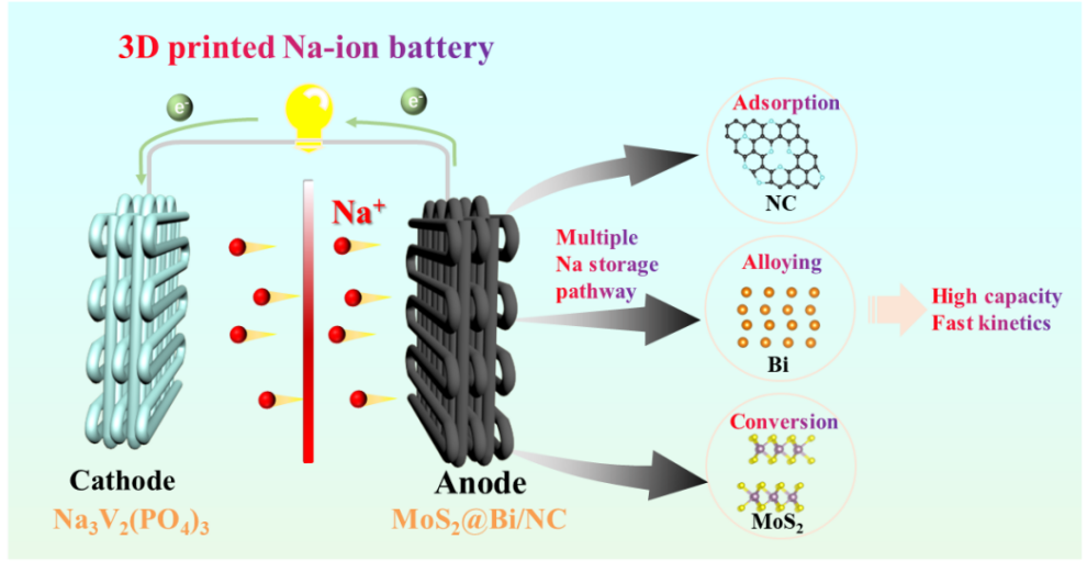 钠离子电池作为最有吸引力的大规模储能设备之一,需要解决容量与倍率性能之间的权衡问题。本研究将具有混合储钠机制的电极材料和高精度电极制备工艺3D打印技术应用于钠离子电池,设计了一种三元复合物MoS2@Bi/NC,实现了高可逆容量(在0.1 A g-1下为604 mAh g-1,初始输出为709 mAh g-1)和优异的倍率性能(在15 A g-1下为169.6 mAh g-1)。通过合理设计结构和界面工程,有效地协同了MoS2的转化型特性、Bi的合金型特性以及N掺杂碳的吸附型特性。基于3D打印技术对电极结构精细调控制备钠离子全电池,负载质量11.7mg cm-2的情况下,1.0 A g-1时具有114 mAh g-1的容量。这项工作将促进3D打印钠离子电池器件的设计,充分发挥混合储钠机制的优势,为钠离子电池的制备提供新的思路。