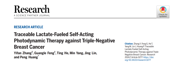 近日,深圳大学医学部生物医学工程学院黄鹏特聘教授团队张一帆助理教授在Science合作期刊《Research》(影响因子11.0,中科院一区,TOP期刊)上发表了题为《Traceable Lactate-Fueled Self-Acting Photodynamic Therapy Against Triple-Negative Breast Cancer》的研究论文。该团队张一帆助理教授和冯光乐硕士生为论文共同第一作者,黄鹏教授为通讯作者,深圳大学为唯一单位和唯一通讯单位,该团队所在的生物医学工程学科属于广东省优势重点学科。