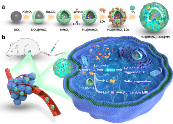 三阴性乳腺癌(TNBC)是乳腺癌中预后最差的一种亚型,主要原因是除全身化疗外缺乏其他有效的治疗方法,而且具有侵袭性。光动力疗法(PDT)通过时空控制的光照实现癌症靶向治疗,产生足够的单线态氧消灭肿瘤细胞。然而,TNBC肿瘤的缺氧状态严重阻碍了PDT的氧气供应。此外,光在TNBC肿瘤中的穿透深度有限。为了解决上述问题,该团队通过在中空二氧化锰纳米粒子中共同负载光克洛(HPPH或Photochlor®)、发光酚和LOx,制备了一种可追踪的以LA为燃料的自运行PDT纳米体系。为了增强肿瘤靶向能力并保护LOx不被水解,制备的纳米粒子用透明质酸(HA)装饰(HLMLH)。刚开始,LOx消耗瘤内LA并产生双氧水。随后,生成的双氧水氧化发光酚产生氨酞酸根离子,并发出蓝色荧光,在约440 nm处达到峰值。然后,化学发光通过发光酚和HPPH之间的化学能量共振转移(CRET)激活HPPH,从而实现荧光成像引导的PDT。同时,中空二氧化锰载体在酸性肿瘤微环境中被双氧水降解并产生氧气,从而改善TNBC肿瘤的缺氧状况,成为PDT的来源。这一过程伴随着锰离子的生成,锰离子不仅可作为活化MRI的T1造影剂,还能催化双氧水分解产生羟基自由基并增强化学发光。因此,HLMLH纳米系统有望对TNBC进行可追踪的自发光/自供氧PDT。