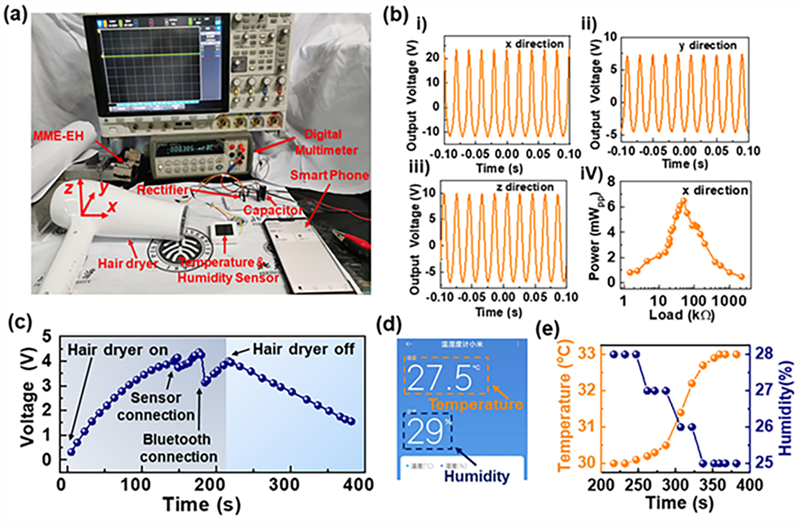 实验结果表明,工作在同相弯曲模式下的T形梁磁-机-电能量采集器,在Hac= 1.75 Oe的弱磁场激励下,可产生98.5 mW的峰峰值输出功率,比传统悬臂梁结构磁-机-电能量采集器的报道的最高输出功率高出262%。本工作建立的等效力学模型指出,新型T形梁器件中的强化的磁机电耦合和输出功率性能源于高达100倍的挠度增益值。此外,论文展示了在0.5 Oe的弱磁场激励下,甚至通过收集常见吹风机产生的杂散磁场,T形梁采集器所产生的能量足以实时驱动无线传感器通信系统。