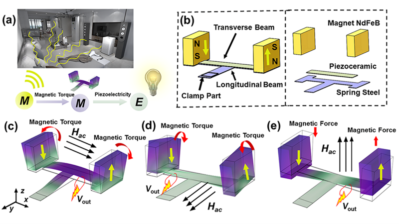 本文提出的基于弯扭协同模态新概念的T型结构能量采集器具备三维正交方向的磁-机-电耦合能力、优异的功率输出性能以及未来在物联网系统自供能模块中的应用潜力,并且将对未来众多基于磁机电耦合原理的器件(如磁场传感器、机械天线等)设计都具有指导和启发意义。