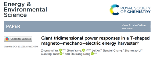 2024年1月23日,能源领域国际顶级期刊Energy & Environmental Science在线报道了董蜀湘教授团队在微能源采集研究领域取得的重要进展。论文题目为:Giant tridimensional power responses in a T-shaped magneto–mechano–electric energy harvester (DOI: 10.1039/d3ee03634k)。在前期工作中,团队提出了压电超材料的协同模态设计方法(Science Advances, 2019, eaax1782),受此启发,本工作设计了独特的弯-扭协同工作模态,仅在单一的T型悬臂梁结构能量采集器中实现了三维正交磁场的高效响应和磁场能量采集。
