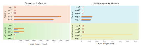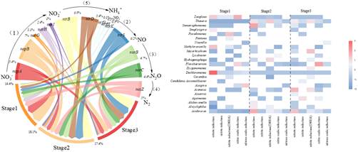 这些结果表明:硝酸盐作为唯一的电子受体,基本上被100%去除。但SO42-导致硝酸盐去除率降低到90%以下。硫酸盐负载取代了Dechloromonas(第一阶段)和Thauera(第二和第三阶段)作为优势属,而它们都包含编码反硝化酶的所有功能基因。此外,Acidovorax也是优势属(第2阶段和第3阶段),但它的丰度远不如Thauera。编码硝酸盐还原酶的基因在所有阶段都是最丰富的,但随着SO42-的增加而减少。其中,napB在SO42-环境下占硝酸还原酶功能基因的最大比例。相比napA基因,功能细菌Dechloromonas和Thauera具有更多的napB基因。因此,硫酸盐抑制了自养反硝化作用,特别是抑制了Dechloromonas及其功能基因napB。本研究为更好地了解硫酸盐对反硝化过程的影响,特别是关键微生物功能基因对硝酸盐去除具有重要意义。