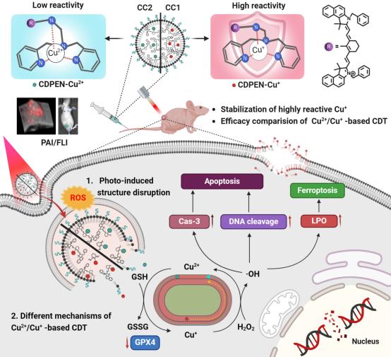 在生物体内,铜离子被认为是参与多种氧化还原反应的核心,与调控肿瘤细胞的增殖和凋亡过程密切相关。然而,关于不同价态铜离子在抗肿瘤机制中的作用尚不明确。本研究设计了一种铜离子或亚铜离子的递送系统,离子通过与N,N-二(2-吡啶甲基)乙二胺修饰的花菁分子形成配合物,再包裹成纳米颗粒,可将不同价态的铜离子递送至肿瘤部位。在含氮基团的保护下,铜离子或亚铜离子能稳定地维持其价态;在激光照射下,花菁分子的结构被破坏,随后释放出铜离子或亚铜离子,触发肿瘤部位的类芬顿反应,产生羟基自由基导致细胞脂质过氧化积累,从而杀死肿瘤细胞。本研究系统地对比了两种不同价态铜离子在抗肿瘤生物学效应上的差异,结果表明亚铜离子表现出更好的抗肿瘤效果。进一步的机制研究揭示,亚铜离子无需谷胱甘肽还原,其产生羟基自由基更快,因此,亚铜离子递送系统展现出更好的抗肿瘤疗效。该研究为深入理解生物体内不同价态铜离子的生物学效应提供了理论依据。