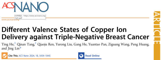 近日,深圳大学医学部生物医学工程学院林静特聘教授团队在国际顶级学术期刊《ACS Nano》(影响因子17.1,中科院一区,TOP期刊)上发表了题为《Different Valence States of Copper Ion Delivery against Triple-Negative Breast Cancer》的研究论文。医学部助理教授贺婷、硕士研究生唐祁南为第一作者,林静教授为通讯作者,深圳大学为唯一完成单位,该团队所在的生物医学工程学科属于广东省优势重点学科。