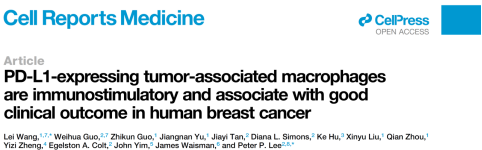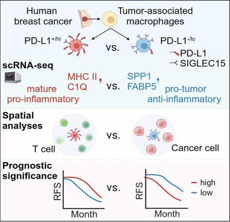 肿瘤相关巨噬细胞(tumor-associated macrophages, TAMs)已知是肿瘤微环境内表达免疫检查点PD1配体PD-L1的主要细胞类型。已有动物肿瘤模型的研究结果多数认为表达PD-L1的TAMs具有针对抗肿瘤T细胞的免疫抑制性,是肿瘤内“坏”的免疫细胞。本研究聚焦乳腺癌患者,运用单细胞以及空间多组学等深度免疫分析技术,发现表达PD-L1的TAMs具有更成熟以及免疫激活性的基因表达谱以及免疫功能表型,反而或是肿瘤内“好”的免疫细胞。该研究成果有助于理解PD-L1在乳腺癌患者TAMs的免疫功能,以及进一步探索PD1/PD-L1免疫检查点在实体肿瘤患者体内复杂的免疫调控机制机理。