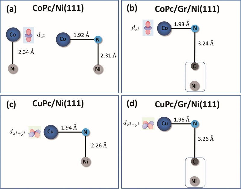 图1:TMPc/Ni(111)与TMPc/Gr/Ni(111) (TM=Co, Cu)体系中的磁交换相互作用机理示意图