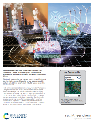 深圳大学化学与环境工程学院范梁栋课题组在可逆固体氧化物电池(CO2还原/CO氧化)研究方向取得研究进展,相关研究成果受邀在Green Chemistry期刊上发表高水平研究论文。