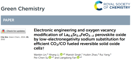 随着现代社会的快速发展,人类对于能源的需求日益增加,传统燃料的过度使用造成了大量温室气体二氧化碳(CO2)的排放,太阳能、风能等新能源又因为其不稳定性等问题限制着其有效利用。利用新能源的多余电量将CO2转化为其他可燃类气体,如一氧化碳或者碳氢燃料气体,是充分利用新能源和节能减排的有效方案。可逆固体氧化物电池(RSOCs)由于其高效的转化效率或者有利的热动力学,受到许多研究工作者的关注并将它们应用在CO2电解/CO氧化中。题为《Electronic engineering and oxygen vacancy modification of La0.6Sr0.4FeO3−δperovskite oxide by low-electronegativity sodium substitution for efficient CO2/CO fueled reversible solid oxide cells》的研究性论文由硕士研究生林万斌为第一作者,深圳大学范梁栋研究员、西安电子科技大学李一航副教授、新加坡南洋理工大学Pei-Chen Su教授为共同通讯作者合著。深圳大学为第一作者位和第一通讯单位。该论文受邀发表于国际期刊Green Chemistry(影响因子9.80,中科院JCR 1区)上,并被内封面highlight。