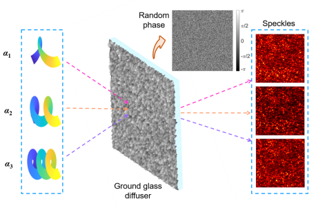 本工作从理论分析、数值仿真和实验实现三个层面系统研究了OAM依赖的散斑特性,发现OAM依赖的散斑互相关图中存在与其OAM相关联的互相关环,并将该特性应用于OAM空间模式识别;在此基础上,将OAM依赖的散斑进一步推广至OAM谱解复用应用,相比于传统方案极大降低了其系统复杂程度。研究结果表明,基于散斑特性的信息提取仍具有巨大的发展潜力。