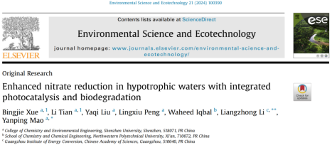 深圳大学化学与环境工程学院毛艳萍课题组在期刊《Environmental Science and Ecotechnology》(影响因子12.6,中科院JCR 1 区)上发表了题为《Enhanced nitrate reduction in hypotrophic waters with integrated photocatalysis and biodegradation》的论文。深圳大学化学与环境工程学院硕士研究生薛冰洁和田里为论文共同第一作者,深圳大学化学与环境工程学院为第一署名单位。