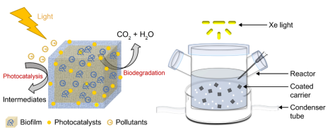 光催化与生物降解紧密耦合技术(Intimatelycoupling of photocatalysis and biodegradation, ICPB)结合了光催化反应和微生物处理的优点,是一种新型的去除生物难降解污染物的技术,研究表明ICPB对硝酸盐具有较好的还原效果。然而,ICPB在低碳条件下还原硝酸盐的效果尚不明确,其微生物代谢机制及菌群结构功能变化需进一步研究。因此,本研究制备了促进硝酸盐光催化反应的催化剂,驯化了稳定高效的生物膜构建ICPB体系。利用物化表征测试手段和分子生物学方法探究不同影响因子对ICPB去除硝酸盐的效果,揭示低碳条件下系统中光催化与微生物降解的协同作用机理,阐明微生物的菌群结构和功能变化规律,为低碳水体中硝酸盐的还原提供了科学依据和技术支持。