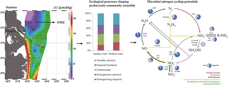 由于全球变暖和环境污染,海洋中的低氧区(OMZs)逐年扩大,严重影响整体的微生物群落结构和全球氮循环。作为世界上最大的冲积河口之一,长江口自20世纪80年代以来已经表现出季节性的低氧区,但其中的微生物群落组成及其对氮循环影响尚不清楚。李猛教授研究团队基于16S rRNA基因和宏基因组测序分析,揭示了长江口水体微生物多样性、群落组装机制和氮代谢潜力。研究发现,长江口不同水层的微生物群落组成具有特定的变化,以变形菌门(Proteobacteria)、拟杆菌门(Bacteroidetes)和蓝细菌(Cyanobacteria)为主,且随机性过程和确定性过程共同塑造了长江口水体微生物群落。研究还发现,pH值是影响表层水体中微生物组成的最重要环境因素,其次是硅酸盐、磷酸盐和离岸距离;而水深、铵氮和磷酸盐则是影响底层水体的微生物组成的主要因素。物种和功能基因分析还揭示了参与氮循环的潜在菌属,发现它们在底层水中具有更高的丰度,特别是执行反硝化和厌氧氨氧化的微生物类群。