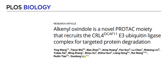 2024年5月20日,深圳大学医学部药学院李国锋助理教授在PLOS BIOL.(IF = 9.8)上发表题为“Alkenyl oxindole is a novel PROTAC moiety that recruits the CRL4DCAF11E3 ubiquitin ligase complex for targeted protein degradation”的研究论文,该研究报道了烯基氧化吲哚作为蛋白靶向嵌合体(PROTAC)的关键组成部分,可有效招募CRL4DCAF11E3泛素连接酶复合体,进而促进特定蛋白的靶向降解,为药物研发提供了一种新的策略。深圳大学医学部博士生王颖、南方科技大学博士后魏天资和深圳大学博士后赵漫为共同第一作者,中山大学洪亮教授、南方科技大学田瑞琳助理教授、深圳大学王锐教授和李国锋助理教授为共同通讯作者,深圳大学为第一单位。