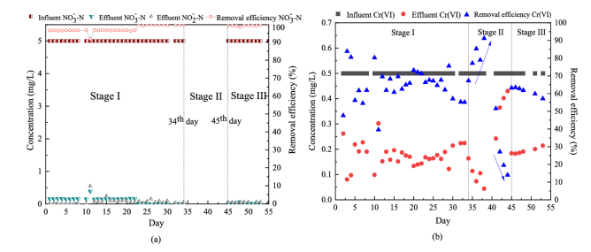 图1 H2-MBfR性能:(a) 脱氮效率和(b) 脱铬效率