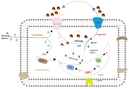 在H2-MBfR中,Cr(VI)和NO3-还原作用之间存在竞争与合作关系。当NO3-和Cr(VI)同时存在时,反应器的NO3-和Cr(VI)的去除率分别为100%和60%。NO3-的去除效果较好,这一结果与热力学计算相一致。宏基因组学分析结果表明,能量消耗型Cr(VI)转运(ChrA)比呼吸性Cr(VI)还原(ChrR-NdFr)更重要,并意味着Cr(VI)的转运很大程度上取决于与氢自养反硝化(NO3-还原)所产生的能量。同时,Cr(VI)的转运可有效阻止Cr(VI)在细菌内积聚而产生的毒性,促进了Cr(VI)的还原。因此,尽管NO3-还原比Cr(VI)还原具有竞争优势,但是Cr(VI)的去除需要氢自养反硝化、Cr(VI)输出和Cr(VI)还原之间的合作。