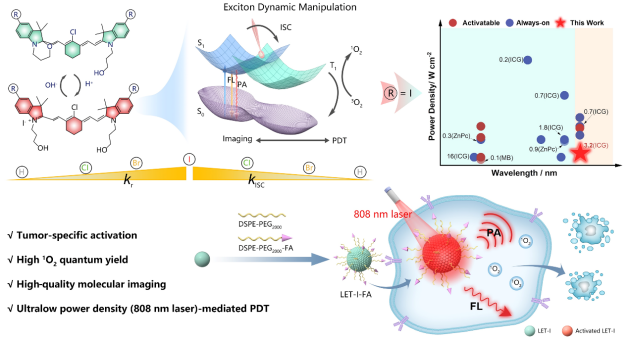 2024年6月,深圳大学医学部生物医学工程学院林静教授团队在国际顶级学术期刊《Angew. Chem. Int. Ed.》(影响因子16.6,中科院一区,TOP期刊)上发表了题为《Dissecting Exciton Dynamics in pH-Activatable Long-Wavelength Photosensitizers for Traceable Photodynamic Therapy》的研究论文。医学部刘宇茸副研究员与硕士研究生张景(现为东京大学在读博士)为第一作者,林静教授为唯一通讯作者,深圳大学为唯一完成单位。该团队开发了一类pH可激活的长波长花菁光敏剂分子用于可视化光动力治疗(PDT)。这类光敏剂能够被肿瘤酸性微环境特异激活,从而减少正常组织的光毒副作用,同时开启NIR荧光(FL)和光声(PA)双模态成像。通过引入不同的卤素调控分子的激子动力学过程,提高光电子的系间窜越(ISC)效率,从而提高单线态氧的量子产率,实现肿瘤高效可视化PDT。