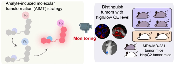 同时,该团队的另一项研究《Carboxylesterase Activatable Molecular Probe for Personalized Treatment Guidance by Analyte-Induced Molecular Transformation》也于近期发表在《Angew. Chem. Int. Ed.》上。该工作提出了分析物诱导分子转变(AIMT)策略,借助羧酸酯酶(CE)激活的半花菁分子探针,实现活体近红外FL/PA双模态成像实时监测CE水平。在小动物盲筛实验中,成功区分高CE水平的肝癌肿瘤(HepG2)和低CE水平的乳腺癌肿瘤(MDA-MB-231)。该工作为指导肿瘤个性化治疗决策提供了一种新思路。深圳大学医学部研究助理李本浩(现为新加坡国立大学博士后)和博士研究生刘恒克为第一作者,新加坡国立大学陈小元教授和深圳大学林静教授为通讯作者,深圳大学为第一完成和通讯作者单位。