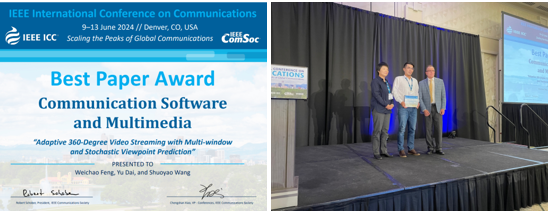 2024年6月9日至13日,IEEE国际通信会议(IEEE ICC 2024: IEEE International Conference on Communications 2024)在美国科罗拉多州丹佛市举行。在本次大会上,我校电子与信息工程学院的论文“Adaptive 360-Degree Video Streaming with Multi-window and Stochastic Viewport Prediction”获最佳论文奖(Best Paper Award),该论文由丁文华院士团队王朔遥副教授指导,我院硕士生冯韦超和戴雨共同完成。论文研究了移动网络下传输360度视频的分发机制,在视口和带宽高度动态的环境下提出了一种感知视口变化的预测方法,通过对实时流媒体系统在时间上的刻画,建模成一个在线优化问题,基于模型预测控制理论,设计一种低复杂度、视口变化感知和高稳定性的在线码率决策算法,旨在提高用户在线观看360度视频的体验质量。