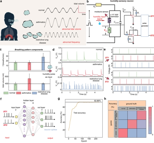呼吸是维持生命的重要生理过程,其异常可能反映潜在的健康问题。心脏病、肺病、睡眠呼吸暂停和高热等疾病都会影响呼吸频率和深度。呼吸监测中的湿度感应技术为临床诊断和治疗提供了新的思路。例如,哮喘患者的呼吸频率正常,但潮气量(每次呼吸吸入/呼出的气体量)异常增大,表明每次呼吸排出的水分比正常人多。相比之下,阻塞性肺病患者的潮气量正常,但呼吸频率异常增高,即比正常情况更频繁地呼出水分。因此,开发能够同时进行湿度感应和处理的硬件系统,有望实现对这些肺部疾病的有效诊断。本研究基于湿敏忆阻神经元和脉冲神经网络,探索了该系统在肺部疾病监测方面的应用。结果表明,该系统在诊断哮喘和阻塞性肺病方面具有 92.68% 的准确率。
