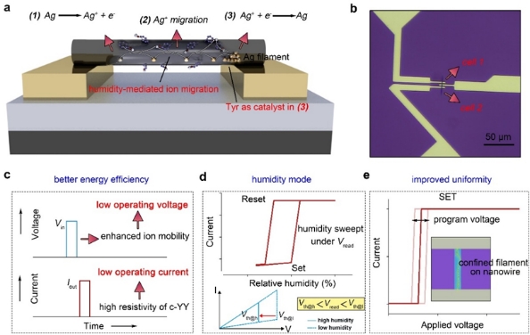 本工作基于前期工作基础(Matter,2021,4, 1702)的延续性研究,聚焦忆阻器能效提升和湿敏感知功能探索,提出了一种新型的湿敏感知神经元,该神经元基于自组装的环酪氨酸二肽纳米线(c-YY NW) 忆阻器。c-YY NW 是一种由两个酪氨酸组成的环二肽,具有独特的质子耦合离子扩散动力学特性和金属离子还原性。研究结果表明,该新型湿敏感知神经元不仅能够有效提升忆阻器能效,还具备出色的湿敏感知性能,为非侵入式健康监测和疾病检测提供了一种高效可行的新方法。