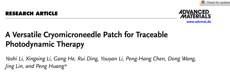 近日,深圳大学医学部生物医学工程学院黄鹏特聘教授团队在国际顶级学术期刊《Advanced Materials》(影响因子29.4,中科院一区,TOP期刊)上发表了题为《A Versatile Cryomicroneedle Patch for Traceable Photodynamic Therapy》的研究论文。这项研究的所有工作均在深圳大学完成,该团队研究助理李雅诗、研究生李星星和博士后贺港为论文共同第一作者,黄鹏教授为唯一通讯作者,深圳大学为唯一通讯单位,该团队所在的生物医学工程学科属于广东省优势重点学科。