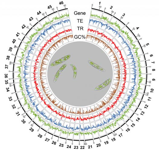 纤细裸藻染色体级基因组图谱,展示了其多层次基因组特征:外圈数字代表46条染色体编号。图谱分为四层:基因密度(绿色)、转座子密度(蓝色)、串联重复序列密度(红色),反映各类元件在基因组中分布的整体情况;GC含量百分比(棕色),反映不同染色体区域碱基组成。中心为纤细裸藻的显微镜图像。
