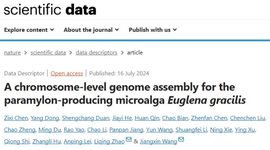 2024年7月16日,深圳大学生命与海洋科学学院王江新教授与化学与环境工程学院赵丽青教授团队在Nature出版集团旗下期刊《ScientificData》(五年平均影响因子:8.9)发表题为“A chromosome-level genome assembly for the paramylon-producing microalgaEuglena gracilis”的研究论文。研究团队利用二代Illumina、三代PacBio、Bionano以及Hi-C测序技术,组装得到高质量的染色体级基因组图谱。该基因组大小约2.37Gb,包含46条染色体,contigN50为619Kb,scaffoldN50为1.12Mb,并注释到了39362个蛋白编码基因。