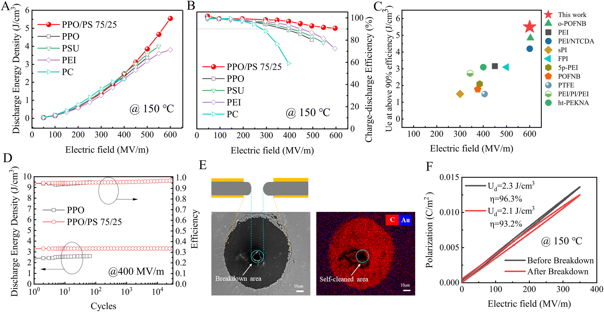 薄膜电容器因其超高功率密度、高耐压性、良好可靠性和易加工性,已成为现代电子设备和电力系统中能量存储和转换的关键元件。然而,现有的聚合物介电材料工作温度较低,导致薄膜电容器在电动汽车、航空航天和地下油气勘探等新兴高温环境中的电力电子应用中无法稳定运行。例如,电动汽车中的近发动机温度可超过120℃,而目前用于电动汽车功率逆变器的双轴取向聚丙烯(BOPP)薄膜电容器的工作温度低于105℃。因此,需要采用冷却系统将工作温度从120℃以上降至约70℃,这增加了额外的重量、体积和能耗。