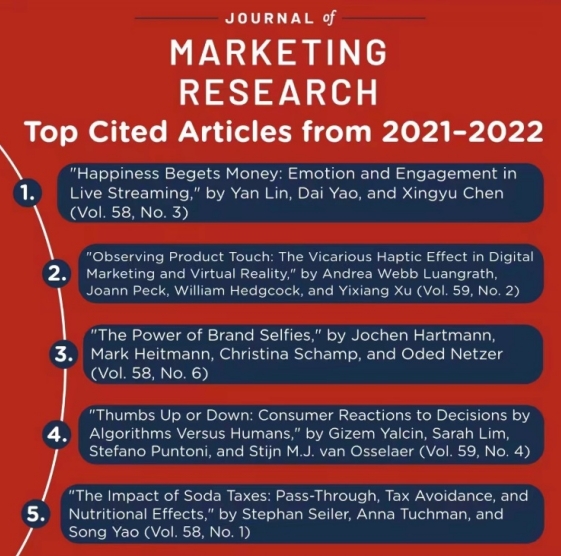 根据UTD 24 顶级期刊 Journal of Marketing Research 最新引用数据,管理学院陈星宇教授和合作者(澳门大学林䶮助理教授和香港理工大学姚岱副教授)于2021年发表的“Happiness begets money: emotion and engagement in live streaming”的论文入选2021-2022年JMR高被引论文第一名(2021-2022 Top Cited Articles #1),也是Web of Science高被引论文(Highly Cited Papers)。此外,这篇论文不仅作为当期首发文章(Lead Article)引领了学术讨论的浪潮,更以其独特的视角和深入的研究方法,成为近三年内JMR最高引用的论文(Most Cited Articles #1),同时在近六个月内收获了较高的读者关注度,位列“Most Read Articles”之列。
