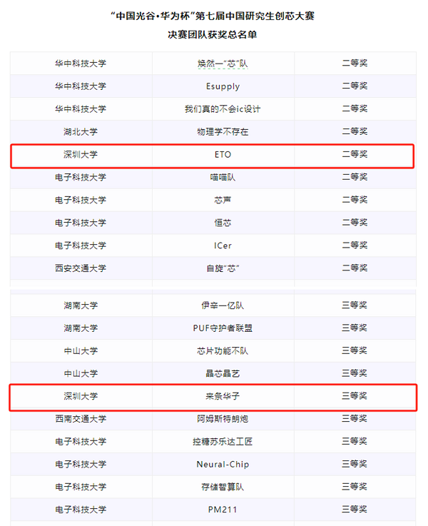 电子与信息工程学院张沛昌、钟世达老师担任指导教师,梁辉鸿、贾东轩、黄龙涛三位硕士研究生组成的队伍“ETO”的参赛项目《EchoChat—基于软硬件协同加速的智能语音交互SoC系统》荣获全国总决赛二等奖。电子与信息工程学院叶文彬老师担任指导老师,林楷翔,蒋睿畅,符宗培三位研究生组成的队伍“来条华子”的参赛项目《基于DVS的超低功耗手势识别AI芯片设计》荣获全国总决赛三等奖。同时,深圳大学被评为本届研究生创“芯”大赛优秀组织单位。