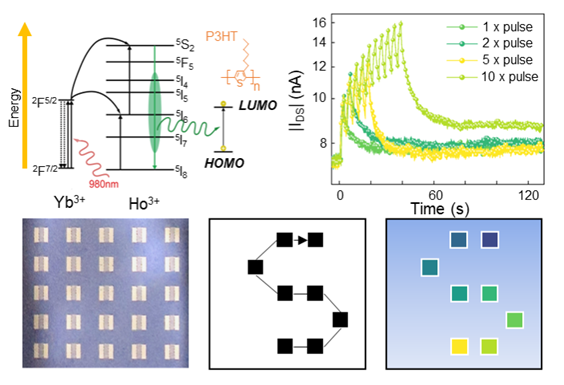 通过传感器内计算开发能够检测和识别运动目标的神经形态硬件是构建分布式计算边缘计算系统的重要组成部分。除了对可见光的反应外,神经形态硬件还应具有感知和处理非可见光的能力,这对于在特殊环境中跟踪目标物体轨迹至关重要。通过将掺杂的LaF3: Yb/Ho上转换量子点(UCQDs)加入到基于聚3-己基噻吩(P3HT)的有机场效应晶体管(FET)的通道中,制备了具有近红外(NIR)响应的有机突触晶体管,作为电荷捕获和红外传感位点。所获得的突触晶体管不仅复制了近红外光照下常见的突触行为,而且还展示了在黑暗条件下动物动态轨迹识别的潜在应用。与其他监测技术相比,掺有LaF3: Yb/Ho UCQDs的P3HT晶体管在近红外响应、高效计算和灵敏度等方面具有明显的优势,为今后的研究提供了实验基础,为下一代智能动态图像识别系统的开发提供设计参考。此项研究得到国家自然科学基金、英国皇家化学会、射频异质异构集成全国重点实验室自主课题、广东省基础与应用基础研究基金、深圳市科创局、深圳大学与台北科技大学2024年合作研究的资助。