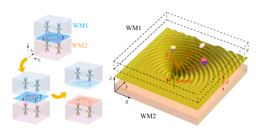 汪国平教授团队提出了一种通过调整空气层厚度来连续改变光子外尔介质中费米弧形状的方法。通过在两层光子外尔介质之间插入不同厚度的空气层,成功实现了费米弧形状从凸形到凹形的的连续变化。此外,研究还发现,凹形的费米弧表面波能够在空气层中实现拓扑保护的电磁牵引力,并且这种牵引力在广泛的入射角度范围内都有效。
