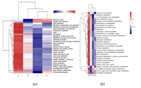 为了理解低电压电场导致E-AnMBR中生物膜变厚这一过程所涉及的机制,我们利用宏基因组技术检测了非电活性细菌群落的功能基因丰度,从而绘制了群落中的元代谢网络图。通过宏基因组分析,从基因水平鉴定了非电活性细菌在电场作用下的代谢途径谱图。功能分析基于KEGG数据库对高丰度代谢途径酶的编码基因进行了标记(图3)。与S4相比,与非电活性细菌生长相关的各种有机物的生物合成和代谢基因(即碳水化合物代谢、脂质代谢和氨基酸代谢)在S2中总体呈上升趋势(图3c),而S1和S3总体呈下降趋势(图3a)。这一结果表明,电场刺激了非电活性细菌的代谢能力。与S4相比,S2的群体感应(QS)基因比SI和S3的要丰富得多(图3b)。QS基因的增加可能有助于细菌之间的信息交换和非电活性细菌的生物膜形成(Sun et al. 2018)。电场还可以干扰微生物群落中的信号通路和通讯机制,包括群体感应,这对生物膜的形成非常重要(Zhou et al. 202b)。氨基酸旺盛的代谢活性(即Glyoxylate和dicarboxylate, Pyruvate,Glycine serine和苏氨酸)进一步证实了这一点(图3a)。基于功能基因预测分析,电场调节碳代谢影响NADH再生和氧化磷酸化编码脂肪酸代谢途径酶的功能基因的增加表明有可能有更多的乙酰辅酶a被燃料注入柠檬酸循环(图4a)。柠檬酸循环途径中编码琥珀酸脱氢酶1.3.5.1、琥珀酸- coa合成酶(6.2.1.5)和2-0xoglutarate reductase[1.2.7.3]的功能基因的高丰度也证实了这一点(图4a)。同时,琥珀酸脱氢酶[1.3.5.1]和2-氧戊二酸还原酶[1.2.7.3]编码的功能基因丰度高,表明会产生更多的氧化磷酸化底物FADH2和NADH。因此,加快了氧化磷酸化的电子传递速度。这表明FADH2和NADH积累,促进了氧化磷酸化过程中的电子转移。事实上,编码氧化磷酸化途径酶的功能基因明显增加(图4b),类似于大多数其他编码参与柠檬酸循环的酶的基因(图4a)。总体而言,电场(0.5 V)通过调节碳代谢影响NADH再生和氧化磷酸化,显著影响非电活性细菌的生物膜形成。3.5. 电场与非电活性细菌代谢途径的相互作用关系代谢途径功能基因、固碳基因、碳代谢基因、TCA循环基因、群体感应基因具有较高的相关系数(图5)。它们的最低相关系数为0.80。说明编码酶的代谢途径基因增加,编码酶的QS基因也会增加。因此,在anmbr中,非电活性细菌是通过电场控制生物膜的关键贡献者。
