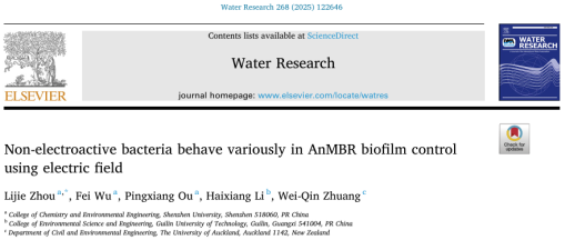 近日,深圳大学化学与环境工程学院周礼杰团队在环境工程领域顶级期刊《Water Research》(Nature Index期刊;影响因子11.4;中科院JCR 1区,TOP期刊)上发表题为《Non-electroactive bacteria behave variously in AnMBR biofilm control using electric field》研究论文。该团队周礼杰副教授为论文第一作者及独立通讯作者,深圳大学为第一作者单位及通讯单位。